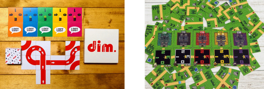 各自自分の手札からタイルを出して場に道タイルを置いていきます。しかし道タイルは画像の左のように重ねておいていくため、以前に置かれたタイルは見えなくなっていきます。