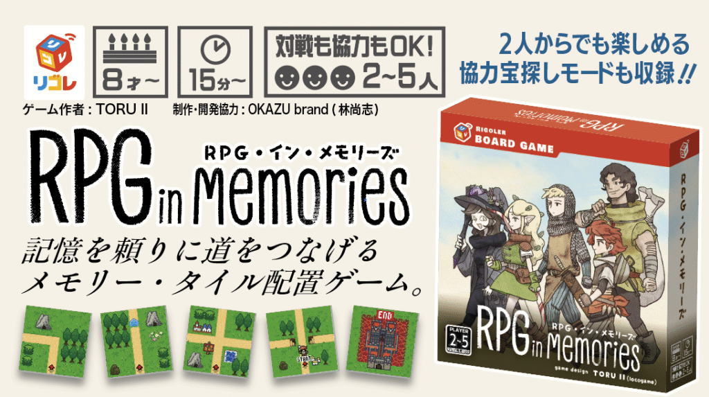 ゲームマーケットにて発売されていたlocogameの人気ゲームであるダンジョンインメモリーのリメイク作品です。リゴレ版ではドイツ年間ゲーム大賞を受賞されたOKAZU brandの林尚志氏が制作した協力モードが収録されます。また従来の対戦モードのルールも多少整理されました。