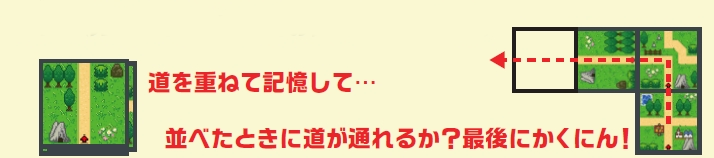 直線、十字路、曲がり路などの道が描かれたタイルをつなげて道を伸ばします。